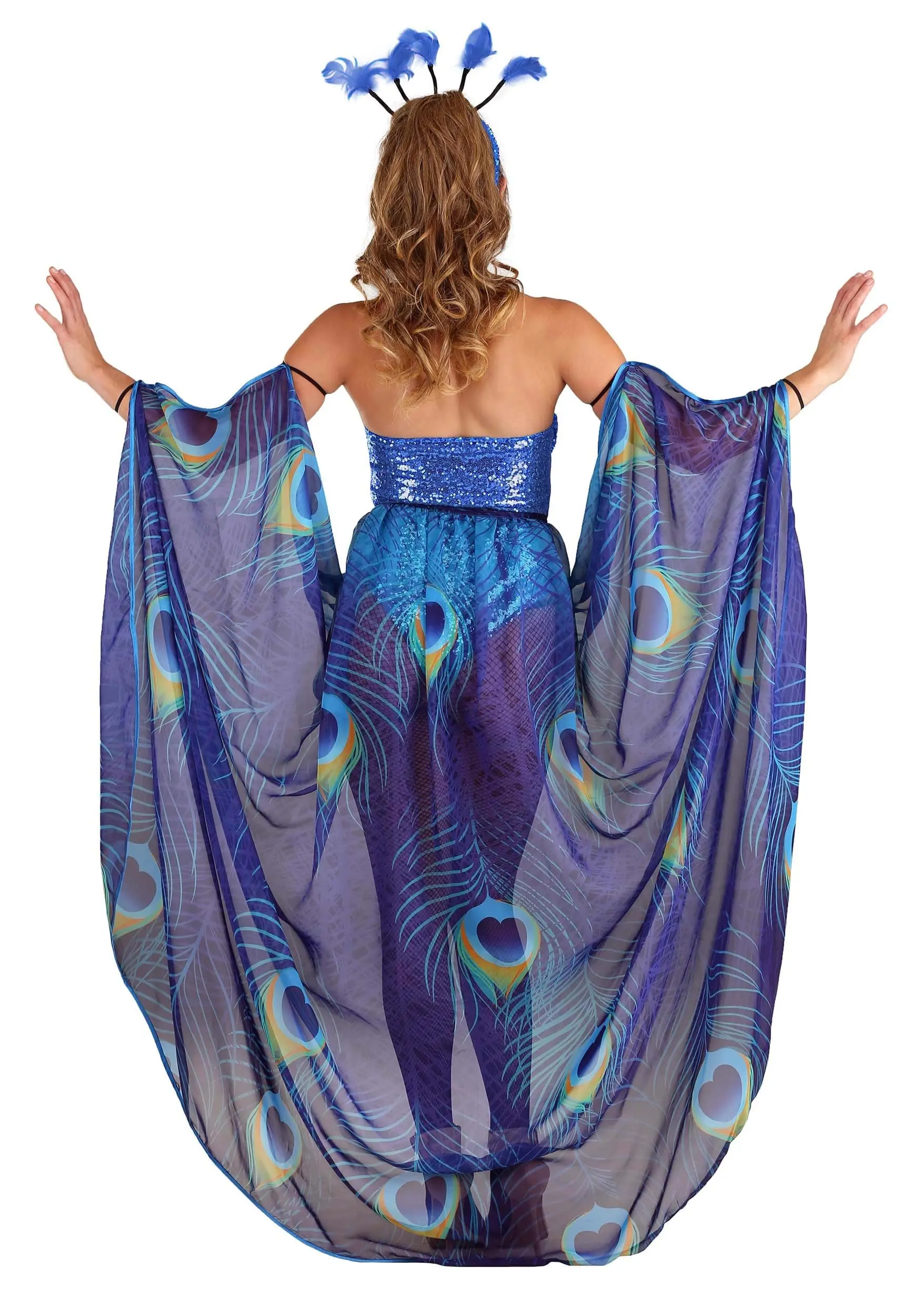 Serve peacocks a dose of their own attention-stealing medicine when you dress in this exclusive Proud Peacock Costume! This glistening three-piece ensemble is sure to garner looks the next time you stroll into the petting zoo or (better yet) a costume party. The costume starts with a vibrant blue sequined leotard shaped to fit skin-tight. The included convertible skirt features a printed peacock feather pattern and ties around the waist with coordinating blue satin. Slip the attached elastic loops onto your arms to turn the skirt into theatrical wings that rise and fall with your movements. Complete the look with the included feather crown headband.