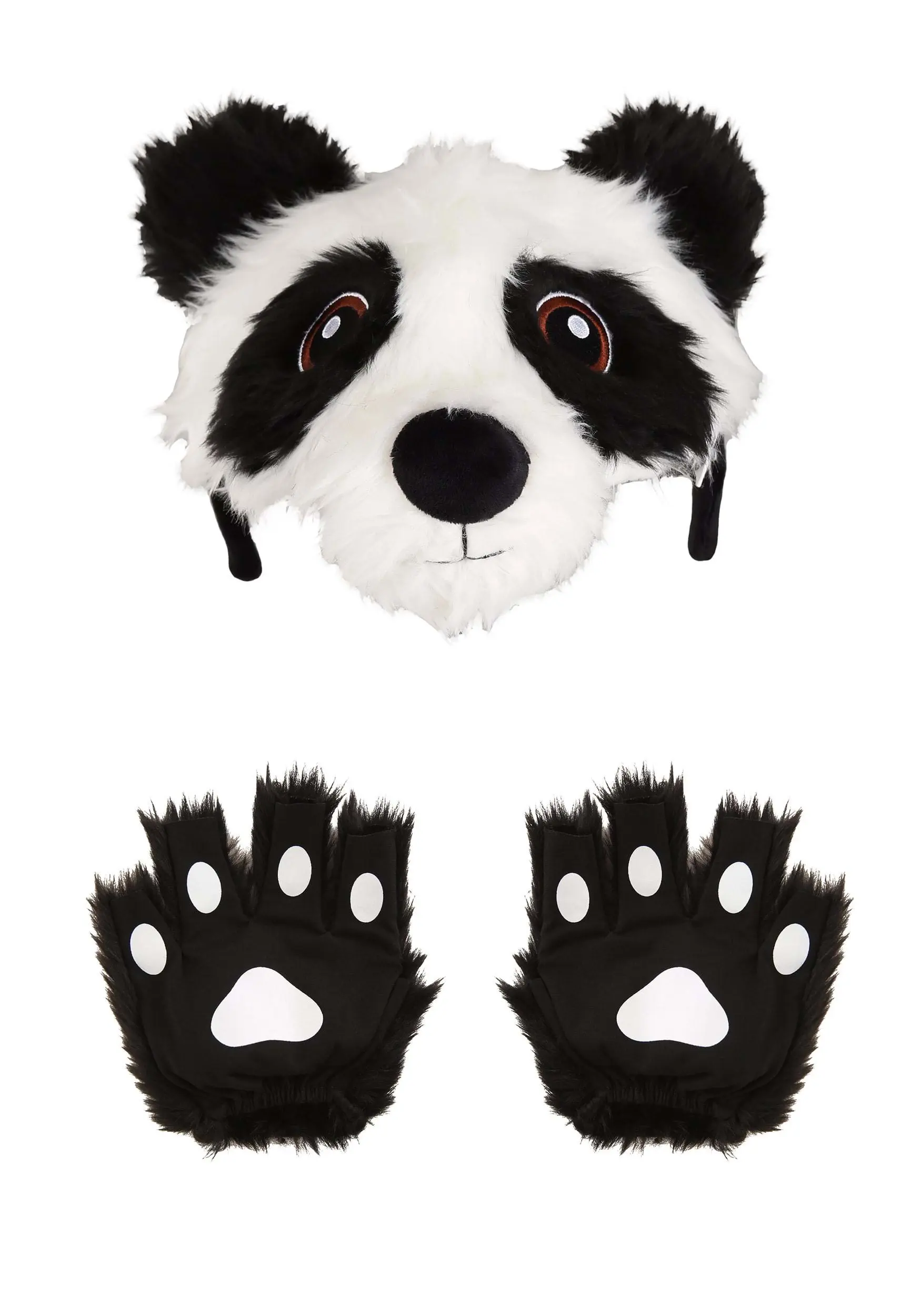 This furry panda kit will help you transform into this classic, majestic creature. The set includes a sculpted panda headband with sweet, sensitive eyes and a furry black and white texture. The panda mitts have a distinct white paw pattern to add some extra panda charm. The mitts have a free thumb for better snacking dexterity.
