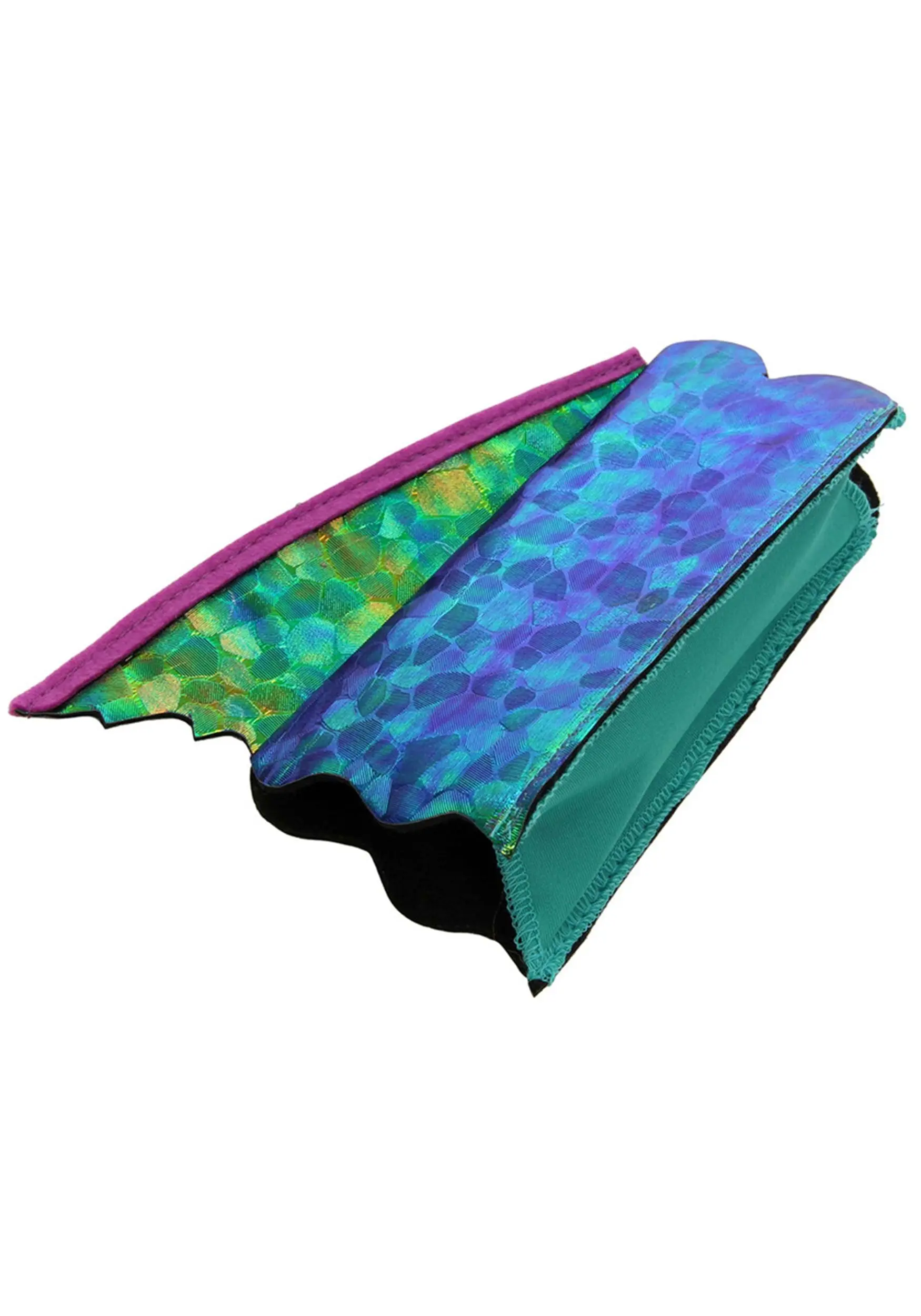 These arm cuffs are all about shine! The scale pattern on the cuffs and fins flashes with different shades of blue green. The fins feature a pink “spine” edge along the long side, while the bottom of each fin and cuff has a scalloped edge to further the scale detailing. If you want more seahorse apparel, we have the matching fin headband on our website! And if you’d rather be a mermaid, a rainbow fish, or another sea animal, these cuffs will add a nice touch.