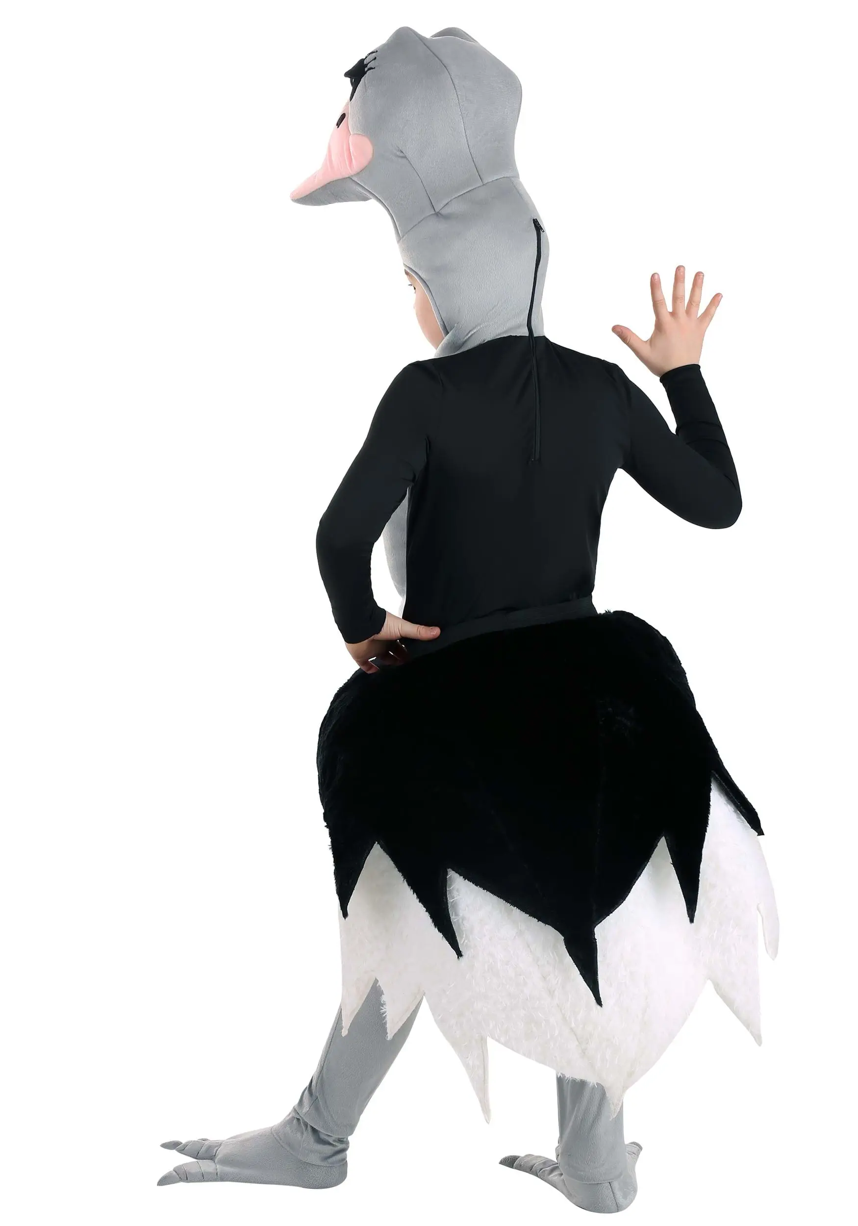 Our in-house design team did a lot of research on ostriches because let’s face it, turning a kid into an ostrich isn’t exactly easy! For instance, they have informed us that this is, in fact, a male ostrich, as it is black with white tail feathers (females are brown in color). Cool, huh? This look succeeds thanks to its clever design, from the stuffed hip and neck pieces to the zip-up ostrich hood and grey leggings with ostrich feet. Ostrich’s eyes may be bigger than their brains, but this is a smart, fun, unique look for your kid’s Halloween!