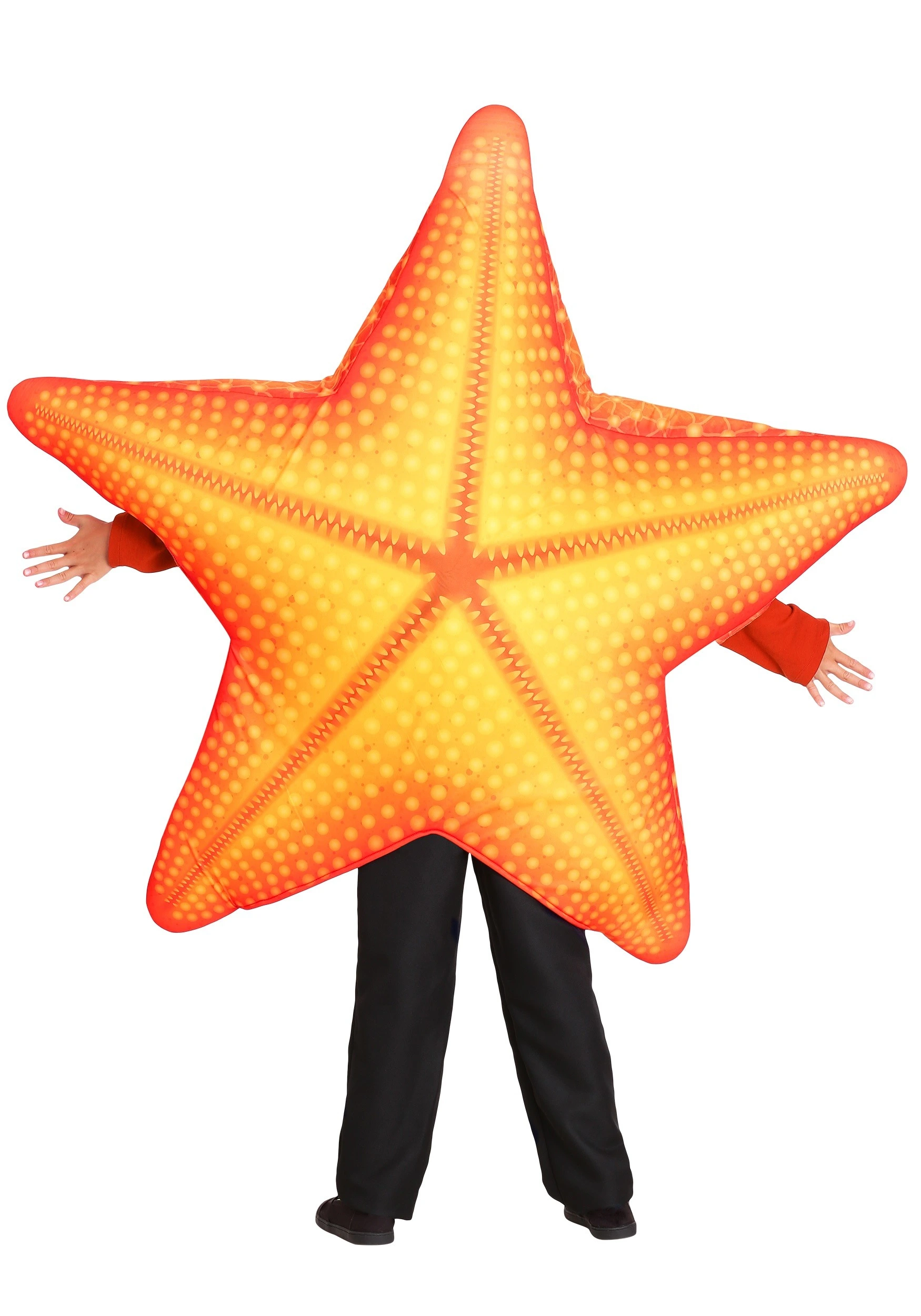 The child starfish costume is a Made by Us design so it’s high-quality and expertly made by our team of talented designers who studied the workings of a starfish for months before producing this gem of a disguise. The star-shaped costume is bright orange and printed with suction cups to look textured. Conveniently, there are holes for the legs, arms, and face. Put it on by placing it over the head and begin life as one of the ocean’s most curious creatures.