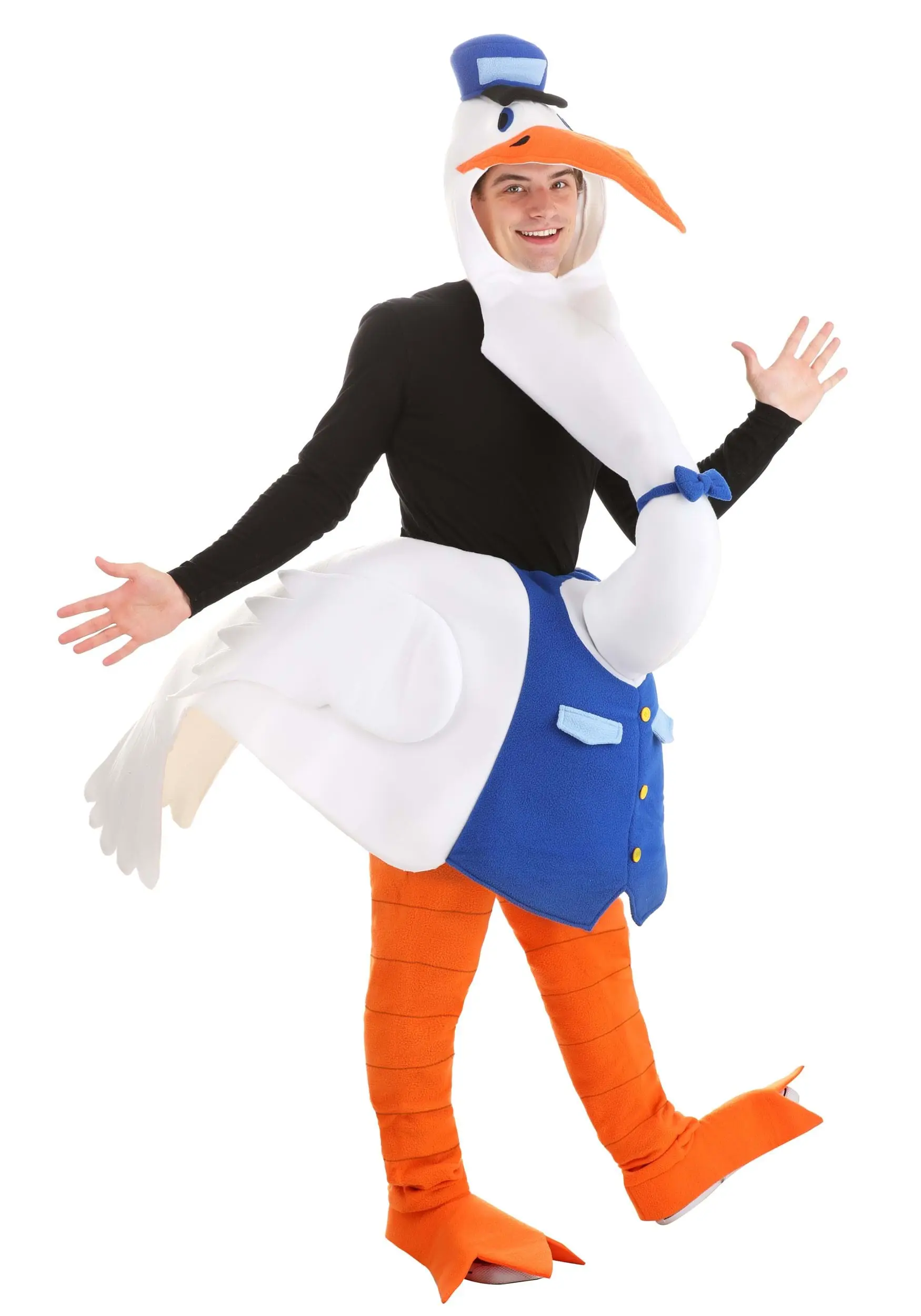 Drop off your packages in style while wearing your exclusive Stork Costume for Adults! The outfit includes a pair of bottoms with an attached mask. From your waist to your knees, it resembles a stork’s white body with oversized wings sticking out the backside, and a blue vest front. The knees to the ankles are orange and include a pair of attached shoe covers shaped like bird feet. A long, stuffed neck attaches the bottoms to the mask, which conceals your entire head except for your face. A stuffed deliveryman hat, printed features, and a long orange bill complete your look!