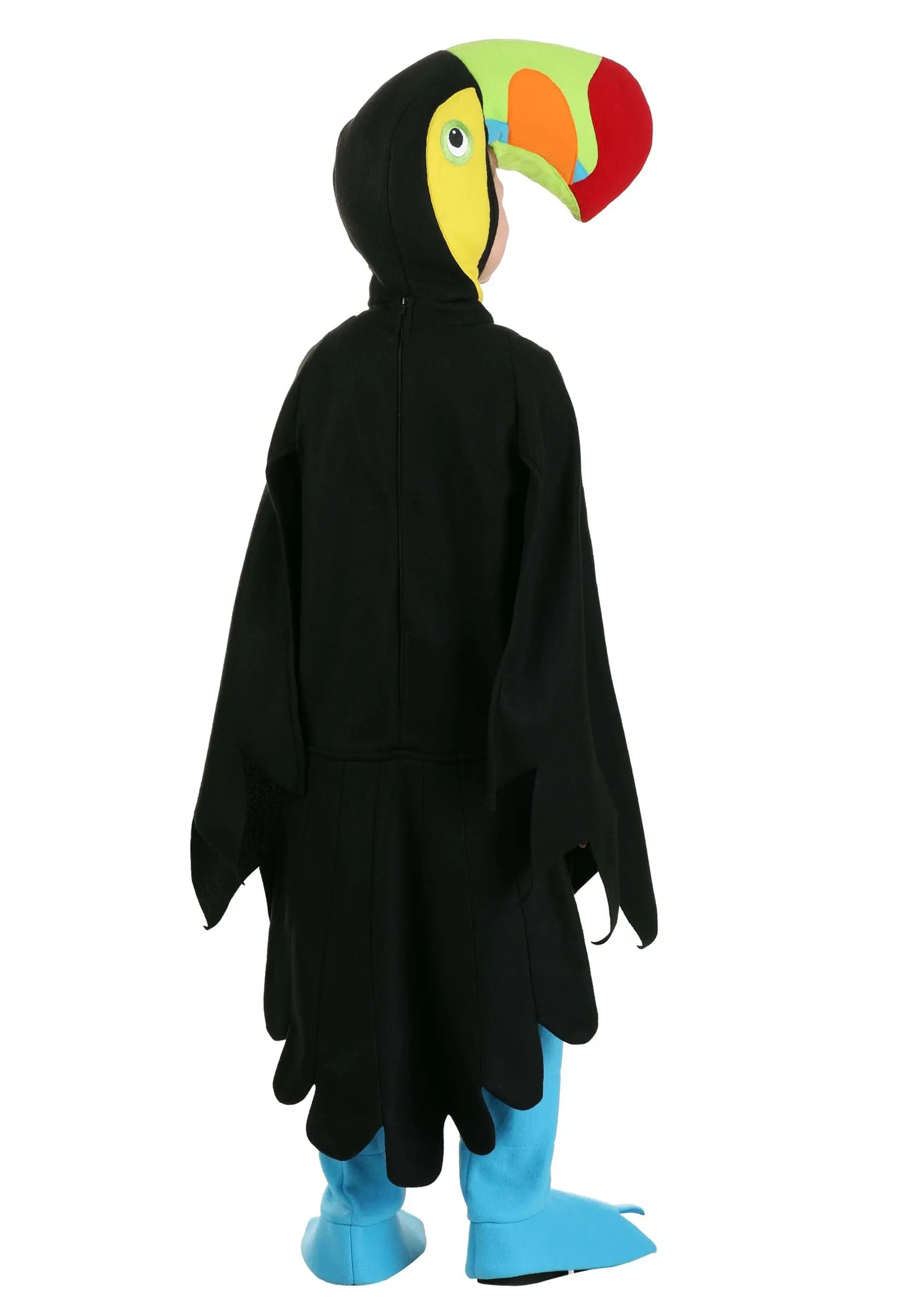 Let your costume aspirations take flight with an exclusive Toucan Costume for Kids! The jumpsuit zips up the back and is made of comfortable fleece fabric. The black upper portion has a long, black wing-shaped drape sewn to each sleeve, and a red and black “tailfeather” section sewn to the back of the waist. The blue legs have elastic sewn into each ankle and attached shoe covers. The yellow fleece headpiece matches the yellow inset on the jumpsuit’s chest. The headpiece is decorated with a large wire-lined beak and embroidered eyes.
