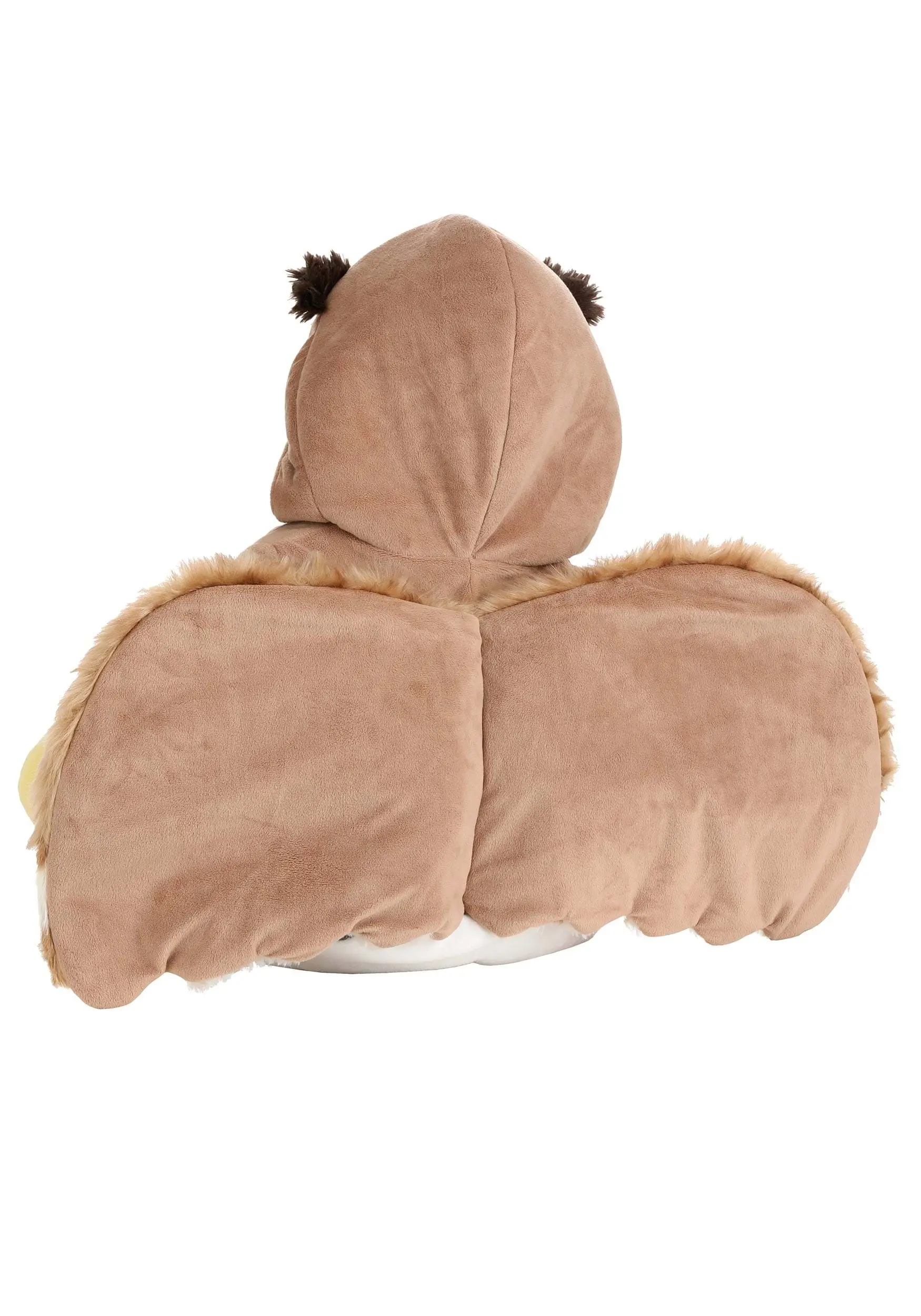 Your little one will hoot for joy in this darling Hatching Owl Infant Costume! The exclusive, jumpsuit-style outfit is made of one hundred percent polyester velour in a calm and snuggly shade of caramel brown. Snaps at the crotch and inseam allow for easy diaper access, while the attached hood pulls over the top of the head and is complete with appliqued, embroidered, and sculpted owl facial features. The faux-fur belly panel resembles and owl’s soft feathers, and looks realistic beneath the pull-on foam-backed shell which fits over the jumpsuit like a pair of briefs. The included foam-backed and faux-fur-lined wings show that this owlet is going places!