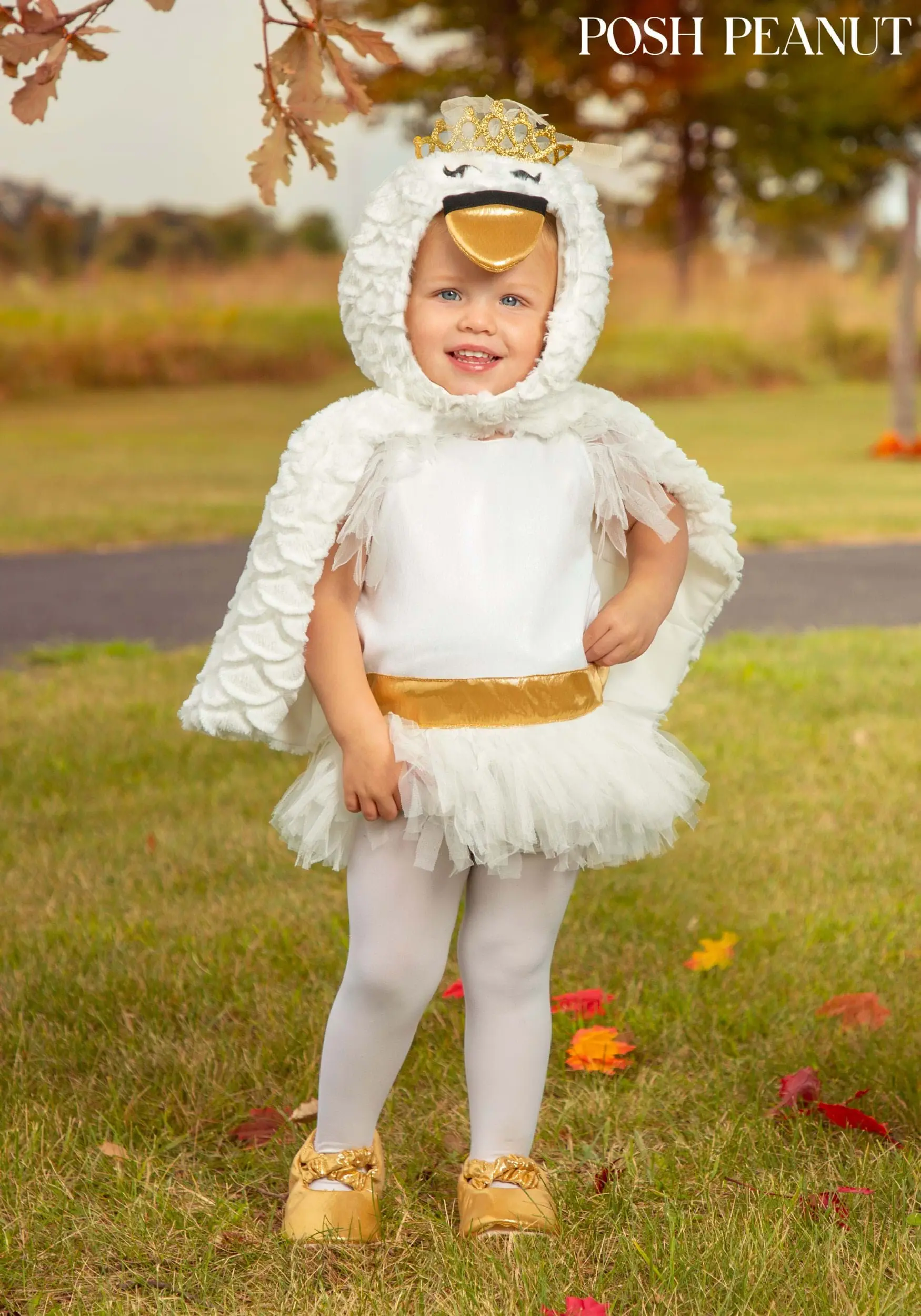 Help your peanut get ready for their very first recital when their playtime becomes showtime in this Posh Peanut Toddler Odet Swan costume. We begin with a delightful dress romper with tulle sleeves and a golden belt and bow around the waist. A tulle skirt will have your peanut twirling and snap closures keep them snug. Let them spread their wings when they wear the plush feather cape and the Odet Swan hood, both with a comfy inner lining. Finally, gold foil shoe covers hold in place with elastic to complete their elegant ensemble.