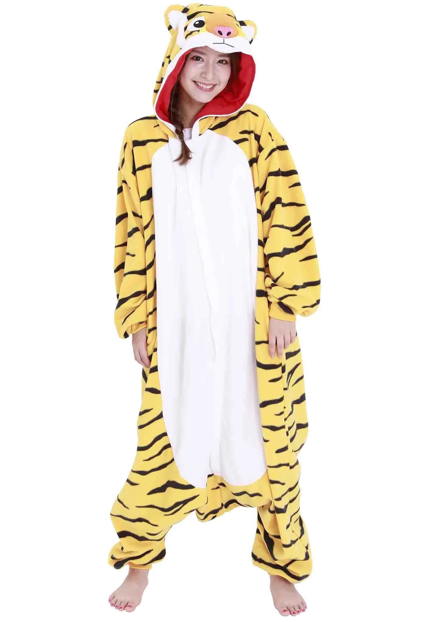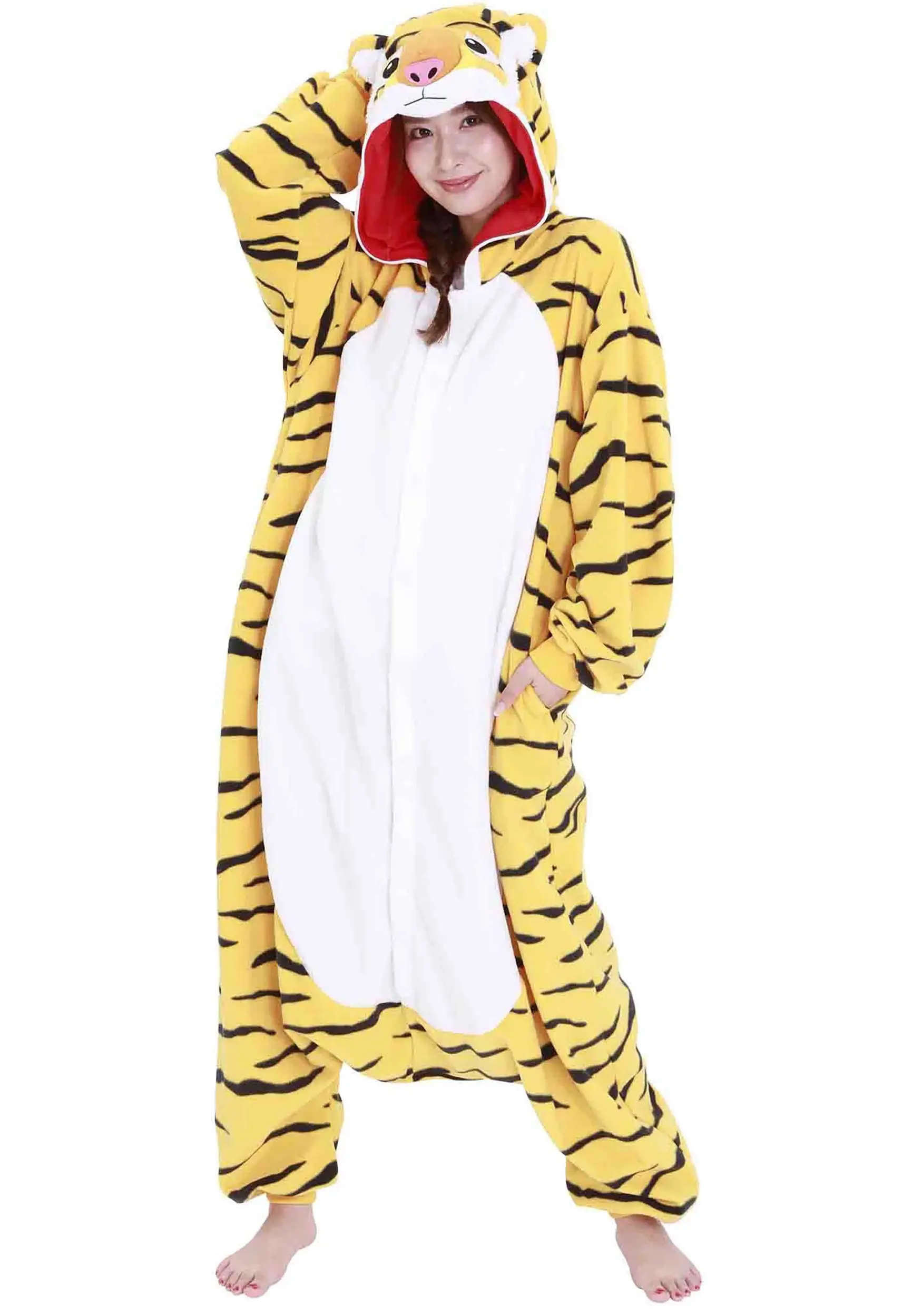 Cuddle up to catch some z’s in style! This Adult Tiger Kigurumi Onesie is just what you need for a really great lazy day OR a really easy costume. The one-piece outfit buttons down the center front. It’s made of white and prange-and-black patterned fleece polyester that’s just as soft as a tiger’s fur (we imagine that it is, anyway. We’ve never dared to pet a tiger.) The attached hood is lined in red, and the outside features tiger face details and ears. Side pockets make this outfit practical as well as adorable!
