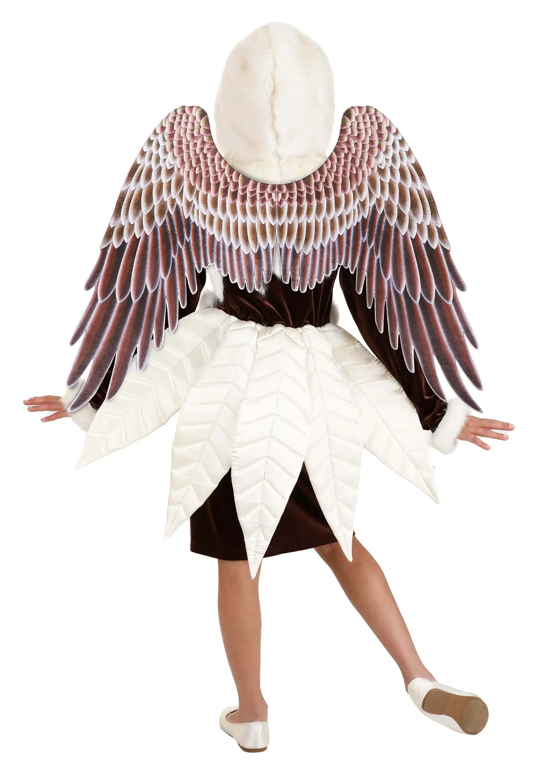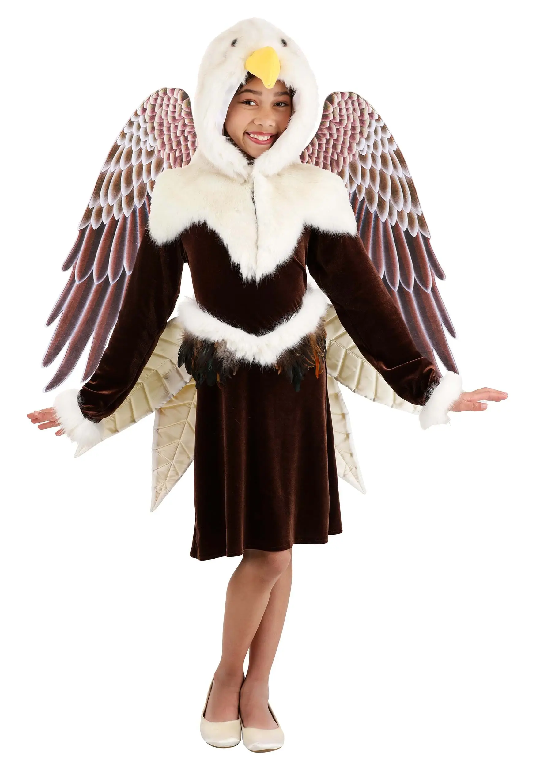 Spread your wings in this exclusive Girl’s Elegant Eagle Dress Costume! The knee-length dress is made of soft brown velour, with white faux fur trim on the sleeve cuffs and waistline. The shoulders and chest are draped with a cowl of faux fur, which is attached to the hood with its soft-sculpted beak and plastic eyes. Brown wings made of stiffened felt secure behind your shoulders with elastic straps, and cream-colored satin “feathers” fan out from the back waistline to form a tail.