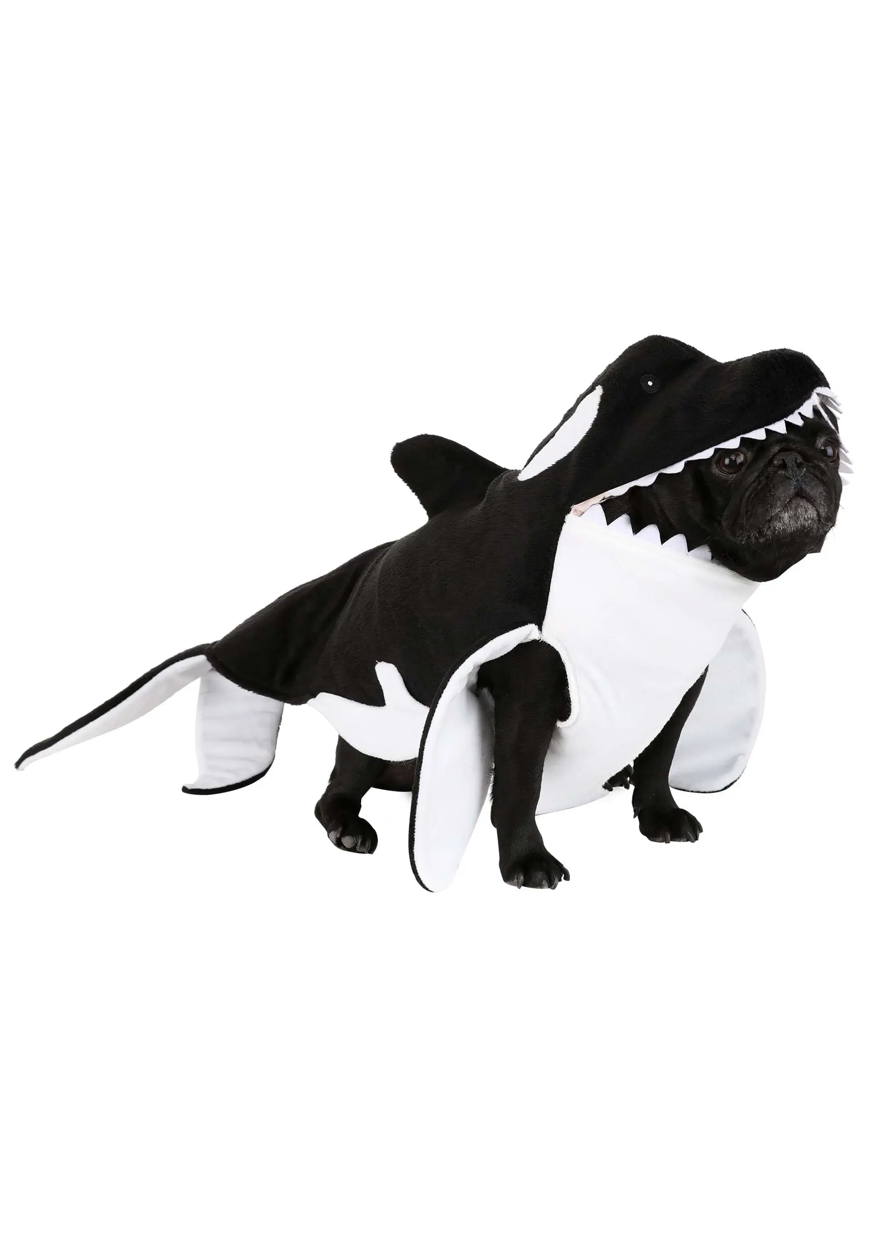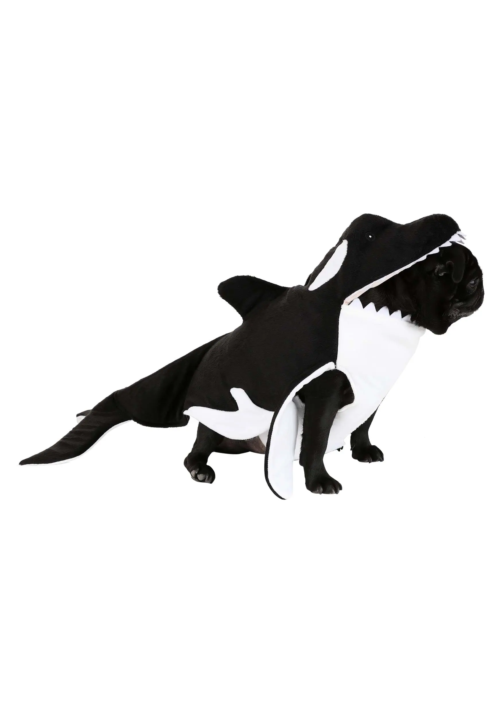 Your fur baby will be the cutest sea creature on four legs in this exclusive Orca Dog Costume! The soft fabric outfit fastens at your pup’s neck and under his tummy. The black back has a tiny, stand-up dorsal fin and a black tail. A soft fabric fin is sewn above the two front leg holes. The underbelly of the costume is white, just like a real orca’s. The attached hood has embroidered eyes as well as a row of felt teeth, and your pup looks out through the orca’s mouth.