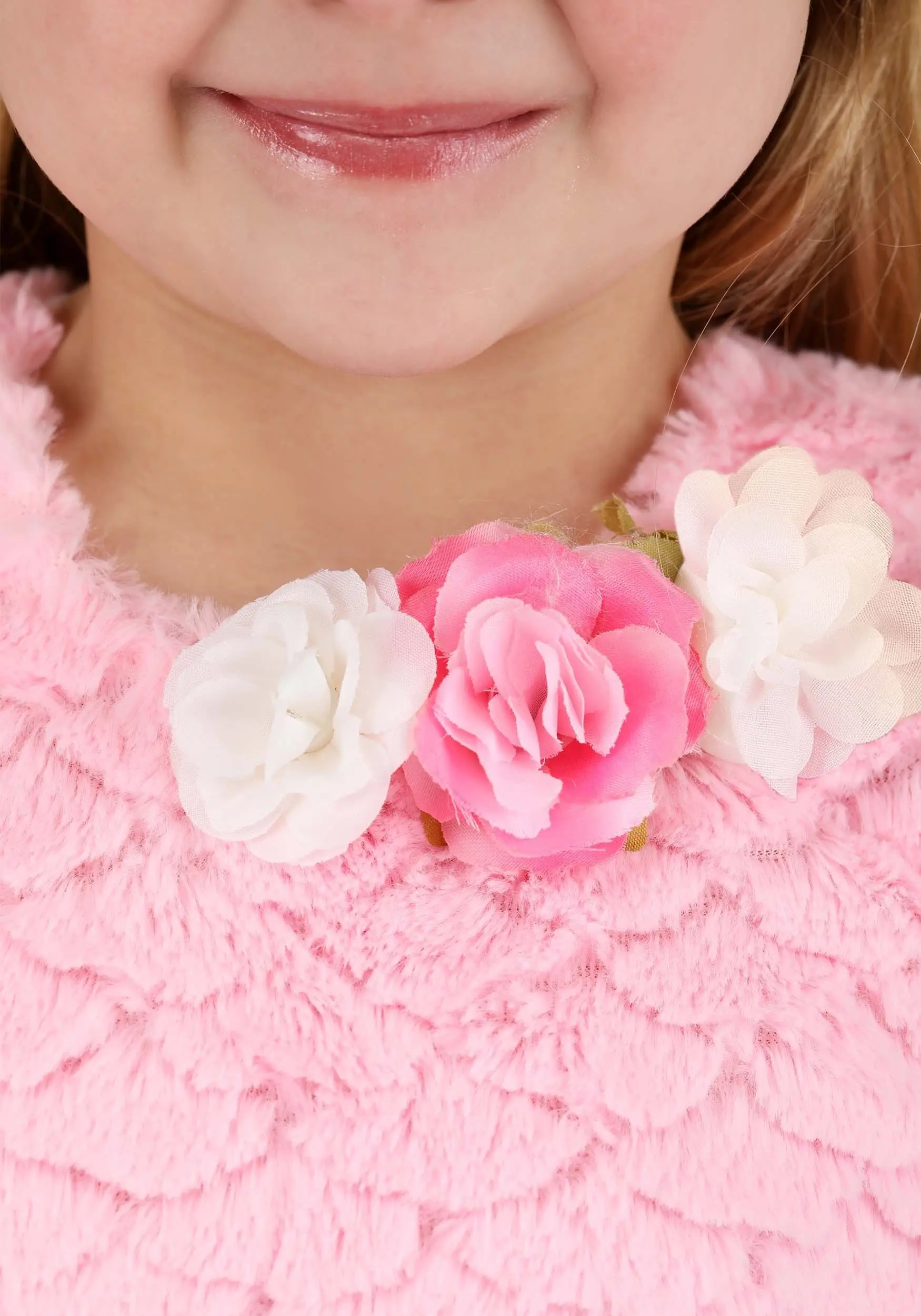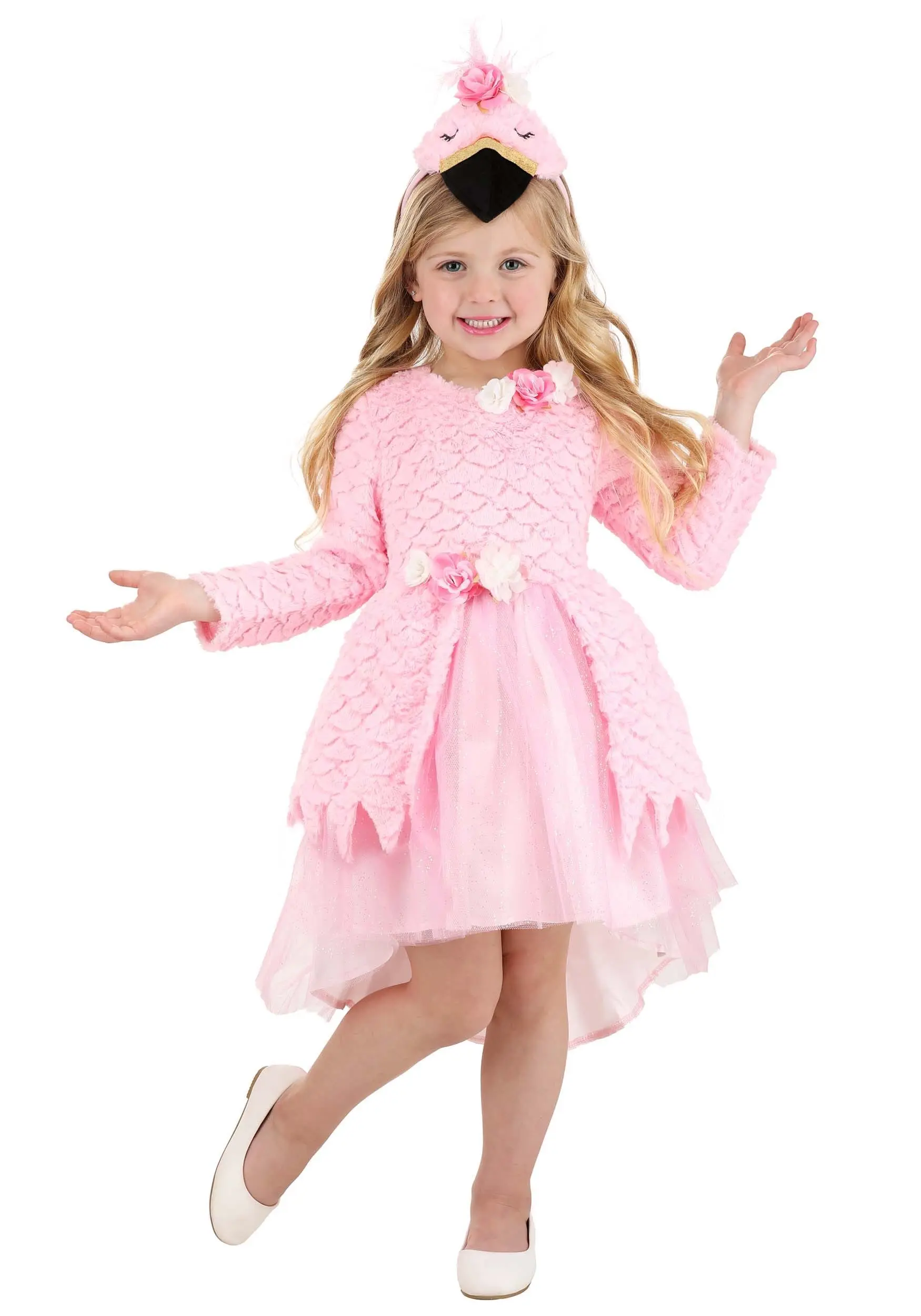 This exclusive Tutu Flamingo Toddler Costume for Girls is the perfect excuse for your little one to channel her inner performer. The lovely, long-sleeved dress zips up the back and features a bodice made of pink faux fur that has been sculpted with a feathery scallop pattern. Fabric flowers are attached to the neckline and the waistline, and pink faux fur panniers drape over the satin and mesh skirt. The fabric-covered plastic headband is decorated with a faux fur skullcap, a black velour “beak,” faux flowers, and a tuft of pink mesh.