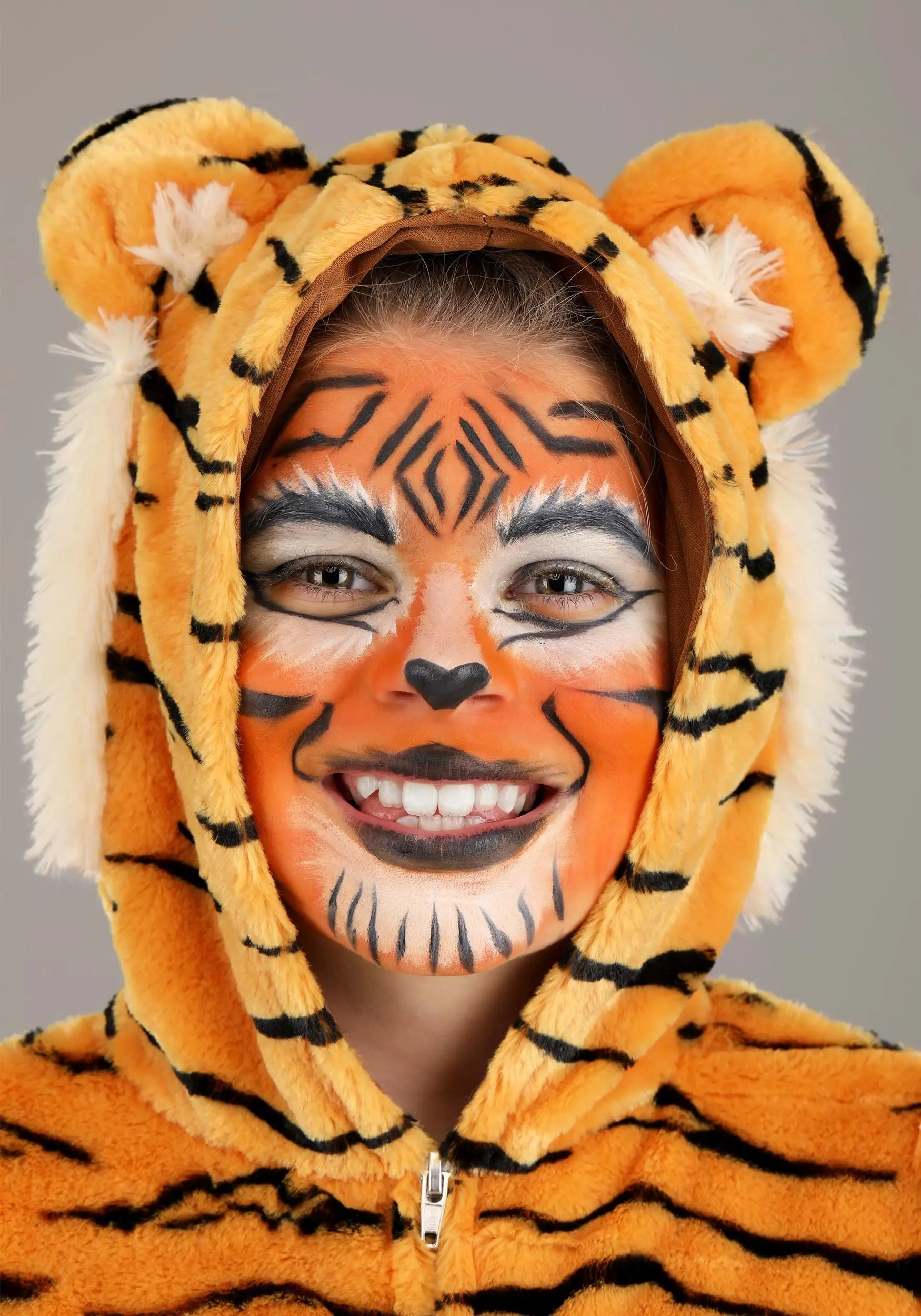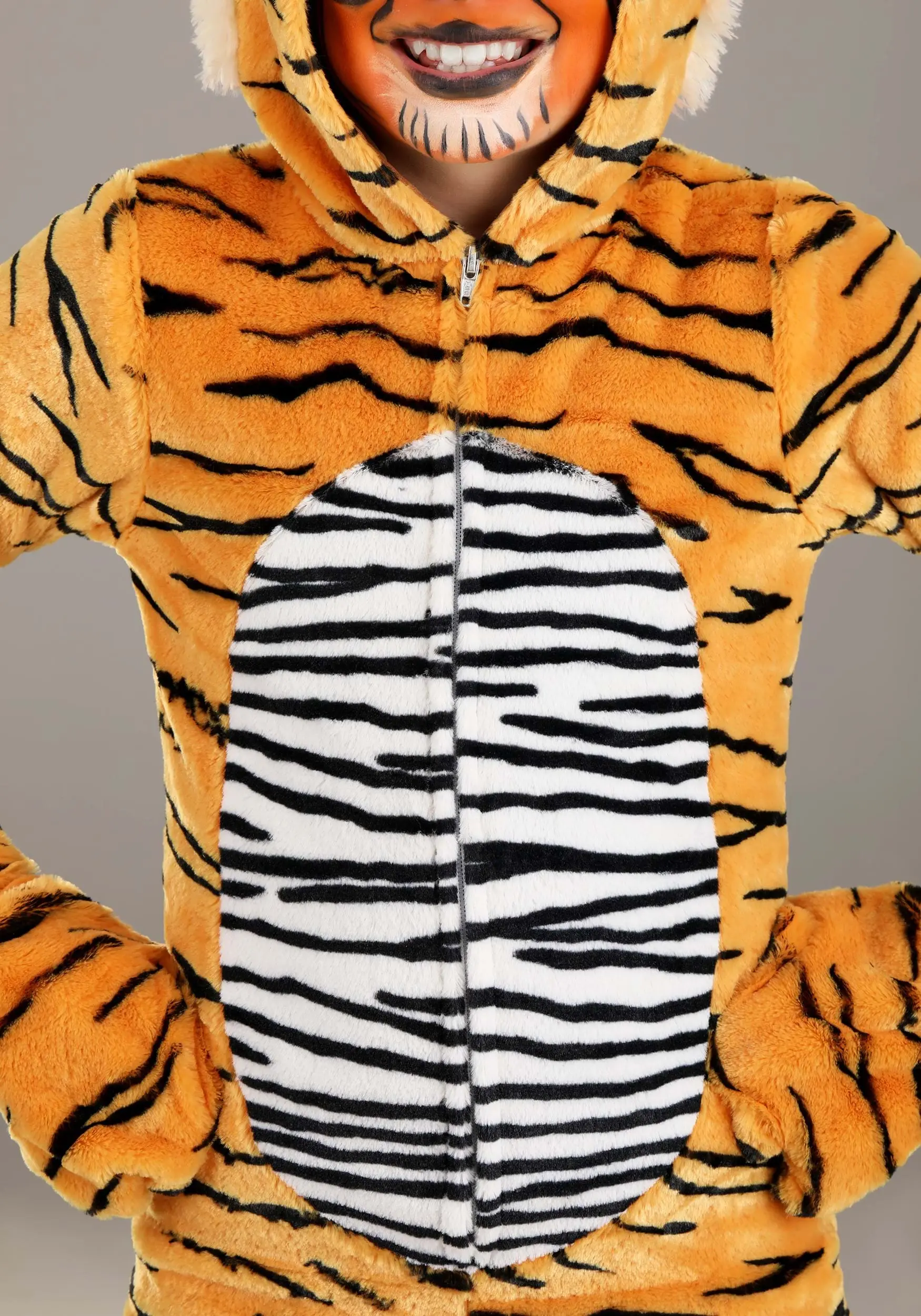 You’ll be “feline” fine when you wear this exclusive Premium Tiger Costume for Kids! The one-piece jumpsuit zips up the front and is made of soft medium-pile polyester faux fur material. Irregular black stripes are printed all over the fabric’s orange background. The torso is sewn with a black-striped white inset. Attached foam-backed shoe covers secure under your feet via elastic bands, and the mitts have appliqued paw pad details. The attached hood features soft-sculpted ears and long tufts of faux fur.Â